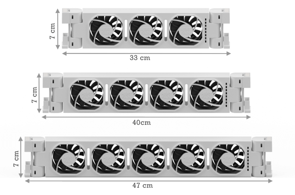 Alle Heatfans zijn 7cm breed, 2.2cm hoog en passen door de klikbare hoekstukken in radiatoren vanaf 2.8cm tussen de platen.