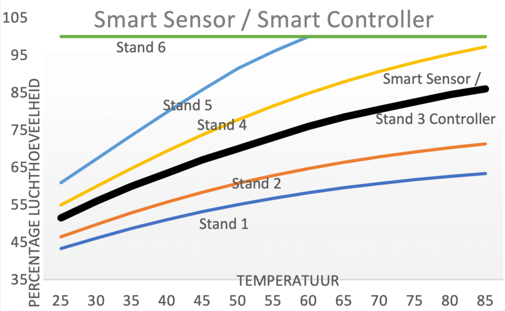 De Smart controller is een instelbare sensor die op 6 standen kan draaien. 1 t/m 5 is modulerend voor het verwarmen. Stand 6 is de cool/boost stand, hierbij draaien de ventilatoren op vol vermogen en zorgen hierdoor voor enige ventilatie.